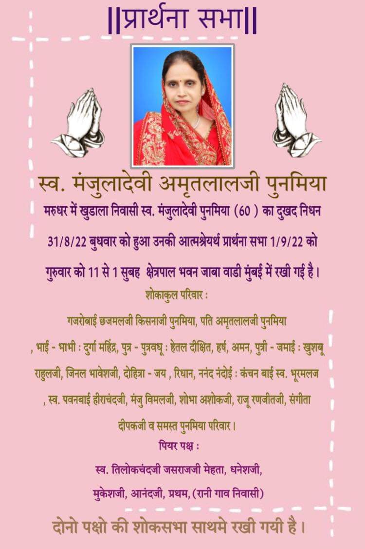 दिवंगत आत्मा की शांति हेतु प्रार्थना सभा 02/03/2024, 11 से 1 रखी गई है स्थल: मुनिसुव्रत जैन मंदिर 4th माला, टेंभी नाका, थाने वेस्ट