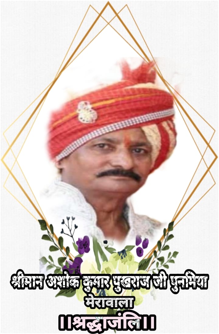 मरुधर में खुडाला निवासी श्रीमान अशोककुमारजी पुखराजजी पुनमिया (मेरावाला) उम्र 69 वर्ष (हाल-मीरारोड) दिनांक 11.02.2023 शनिवार को श्री शंखेश्वर तीर्थ में अठम तप दरम्यान अरिहंत शरण हुआ है।